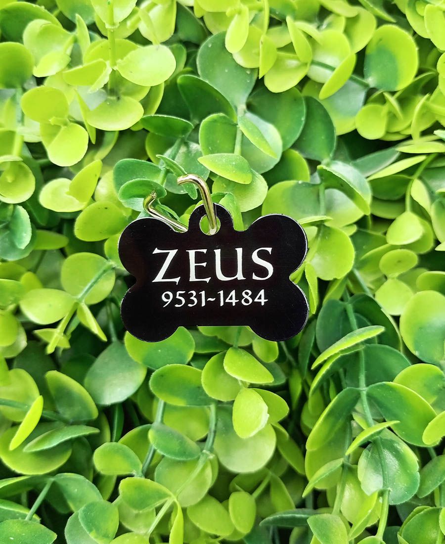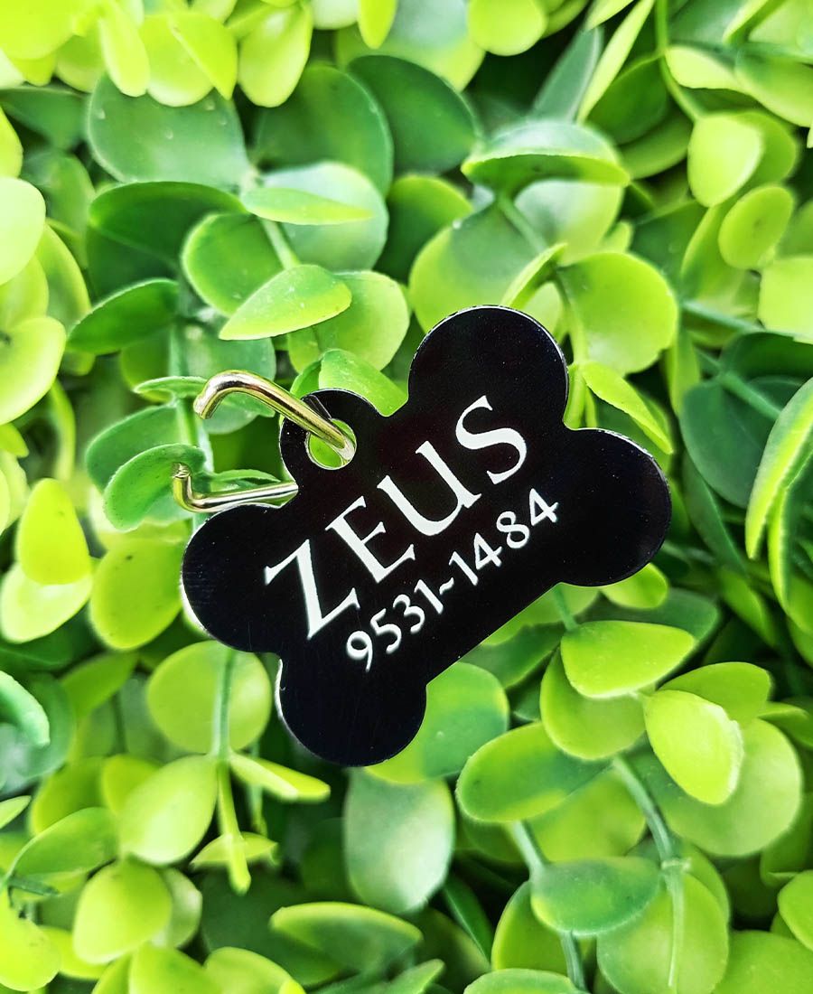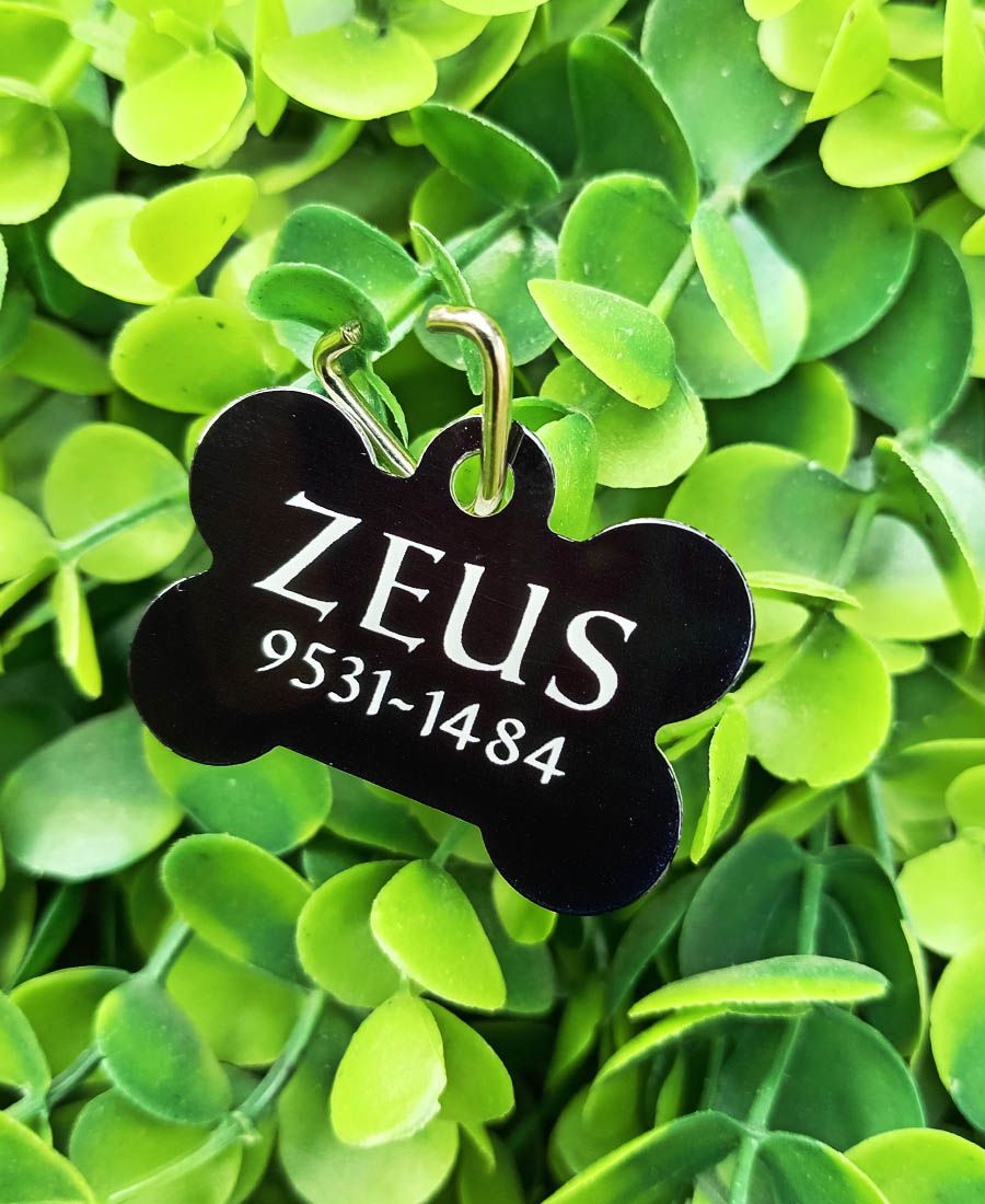 Placa para mascota personalizada con el nombre Zeus, perfecta para perros fuertes, líderes o con gran personalidad. Fabricada en metal duradero con grabado láser de alta precisión. Incluye información de contacto y resistencia a agua y desgaste. Un accesorio funcional y estilizado que combina identidad, seguridad y un toque mitológico único.